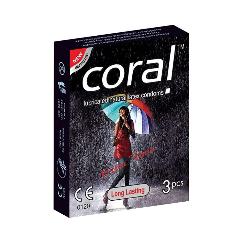 "Extend your pleasure with Coral Lasting Extra Time Lubricated Natural Latex Condoms. Designed to enhance stamina and prolong intimacy, these condoms feature a special lubricant to help delay ejaculation and extend your enjoyment. Crafted with premium natural latex for reliable protection, Coral Lasting Extra Time condoms offer both confidence and comfort. Explore the sensation of lasting longer and intensify your connection with your partner. Elevate your pleasure and savor every moment with Coral Lasting Extra Time Lubricated Natural Latex Condoms."