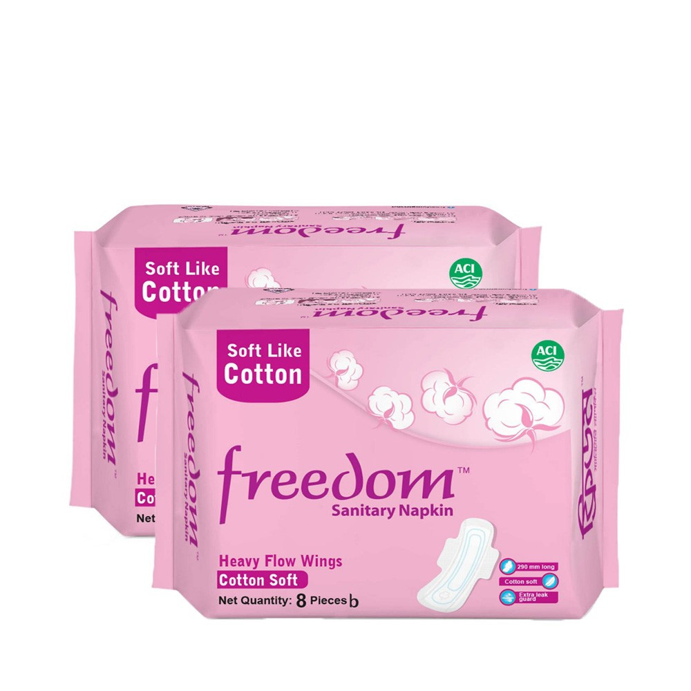 "Experience freedom and confidence during heavy flows with Freedom Sanitary Napkin (Heavy Flow Wings). With superior absorbency and secure wings for added protection, these pads offer reliable leak-proof coverage. Designed for maximum comfort, they feature a soft, breathable top layer and a contoured shape for a snug fit. Stay comfortable and worry-free throughout your day with Freedom Sanitary Napkin (Heavy Flow Wings). Each pack contains 8 pads to keep you covered whenever you need it most."