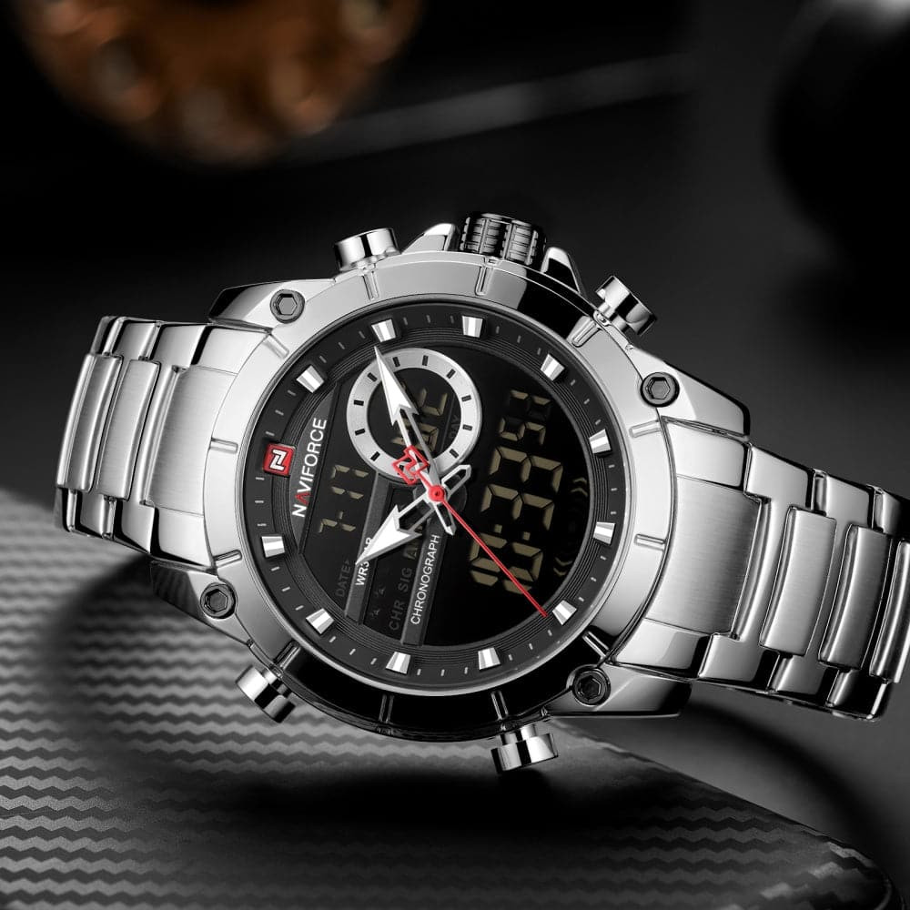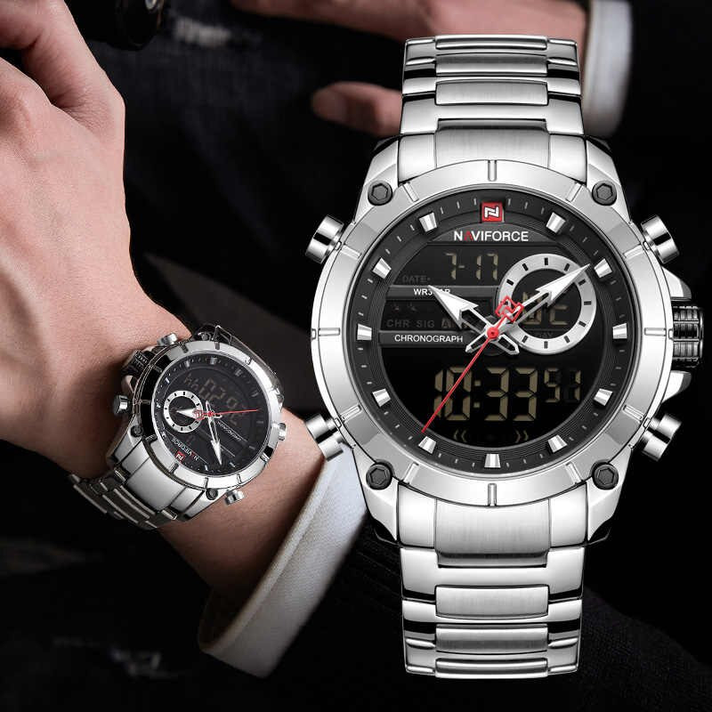 NAVIFORCE 9163 Silver Black Dial Stainless Steel Dual Time Men's Watch