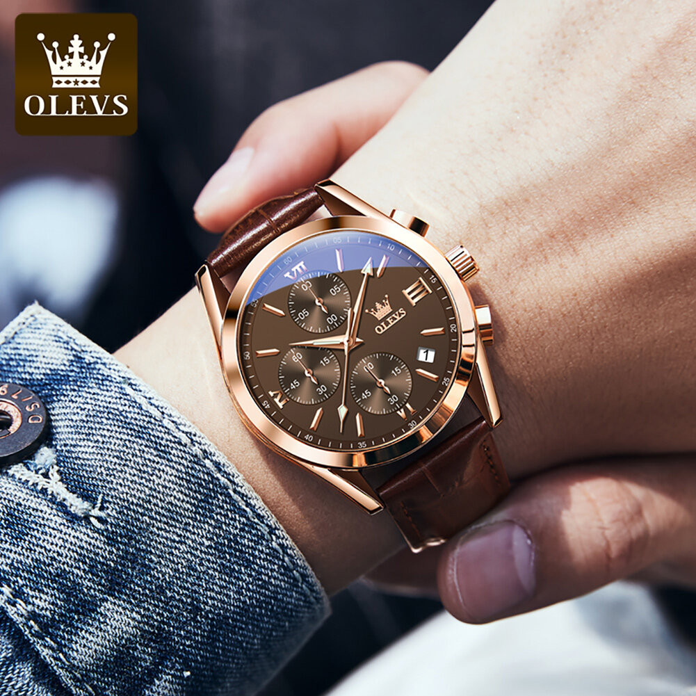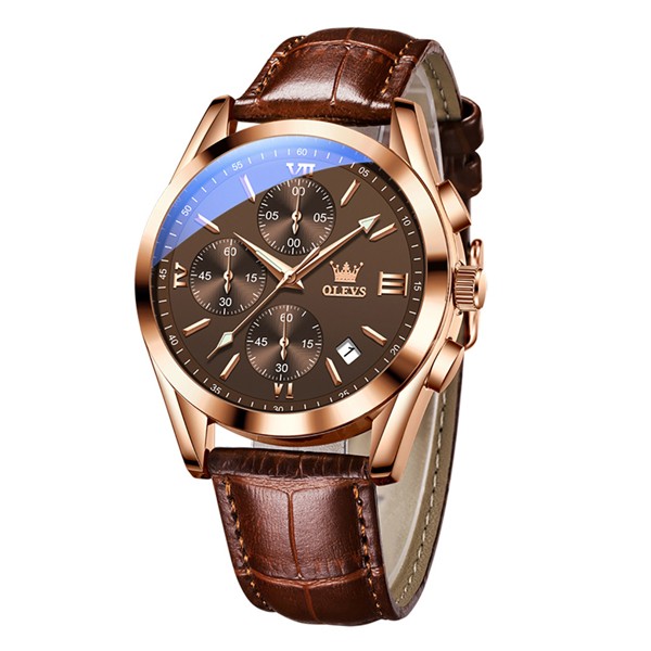 OLEVS 2872 Waterproof Genuine Leather Belt Quartz Wrist watch for Men's-Rose Brown