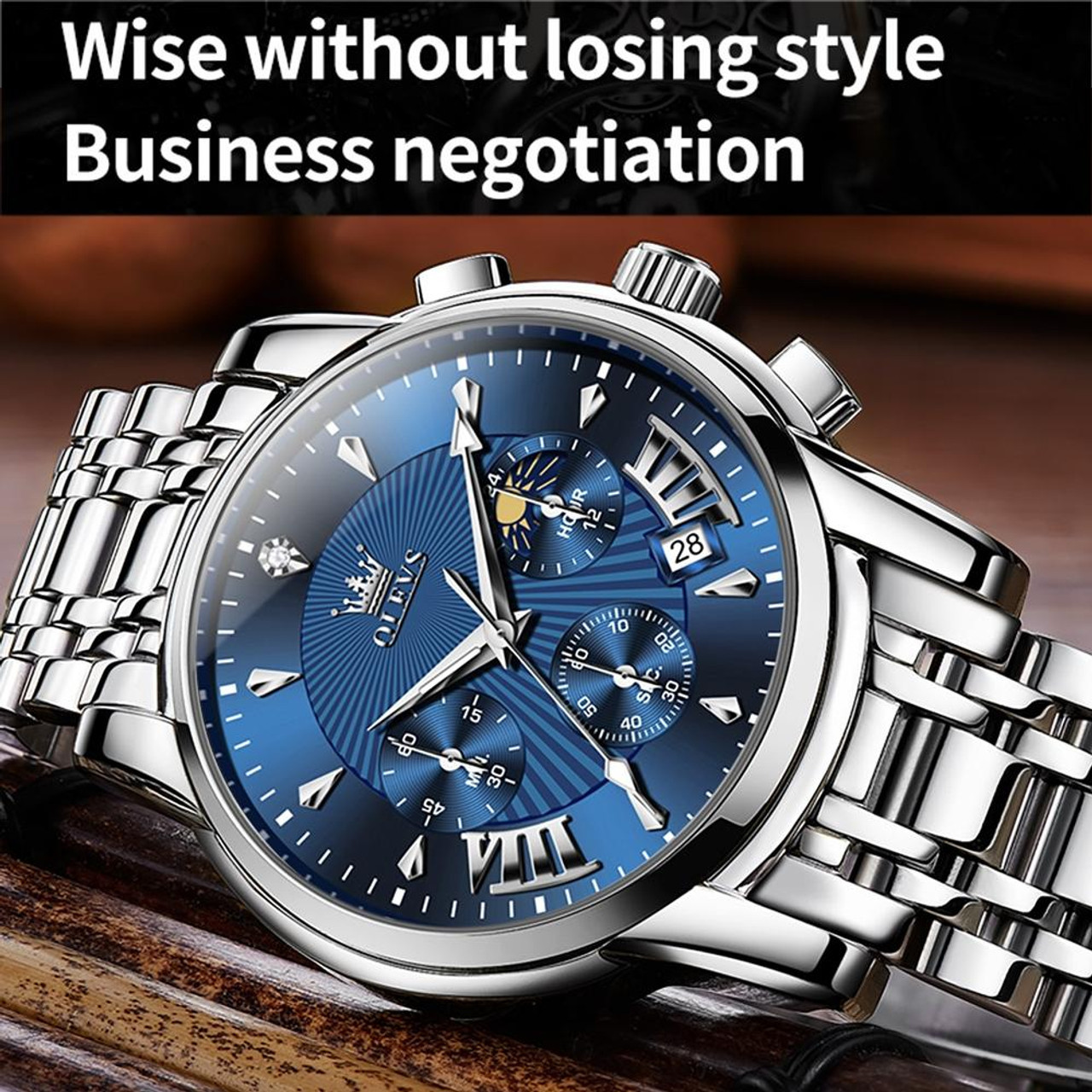 OLEVS 2892 Stainless Steel Waterproof Fashion Chronograph Silver & Blue Dial Quartz Watch For Men's