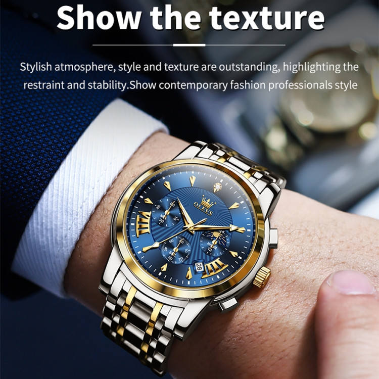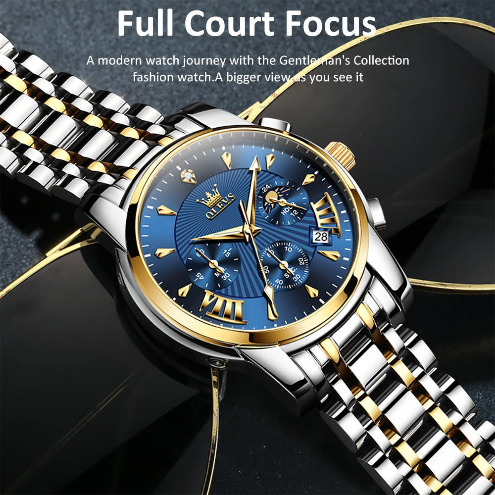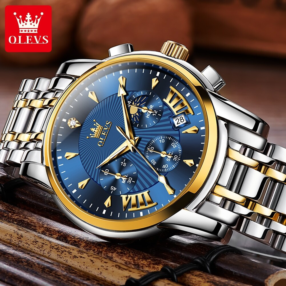 OLEVS 2892 Stainless Steel Waterproof Fashion Chronograph Silver Gold Blue Dial Quartz Watch For Men's