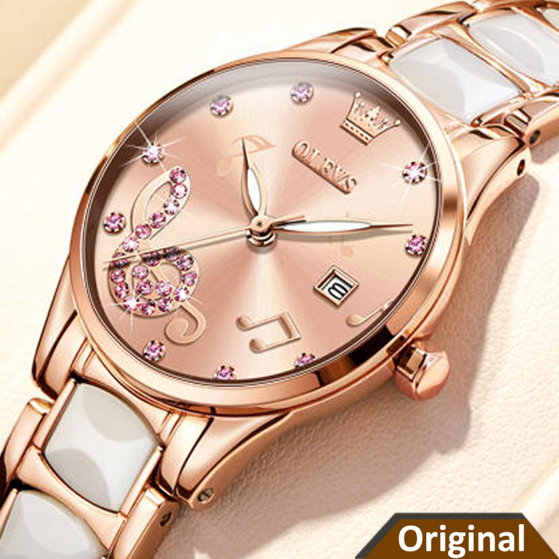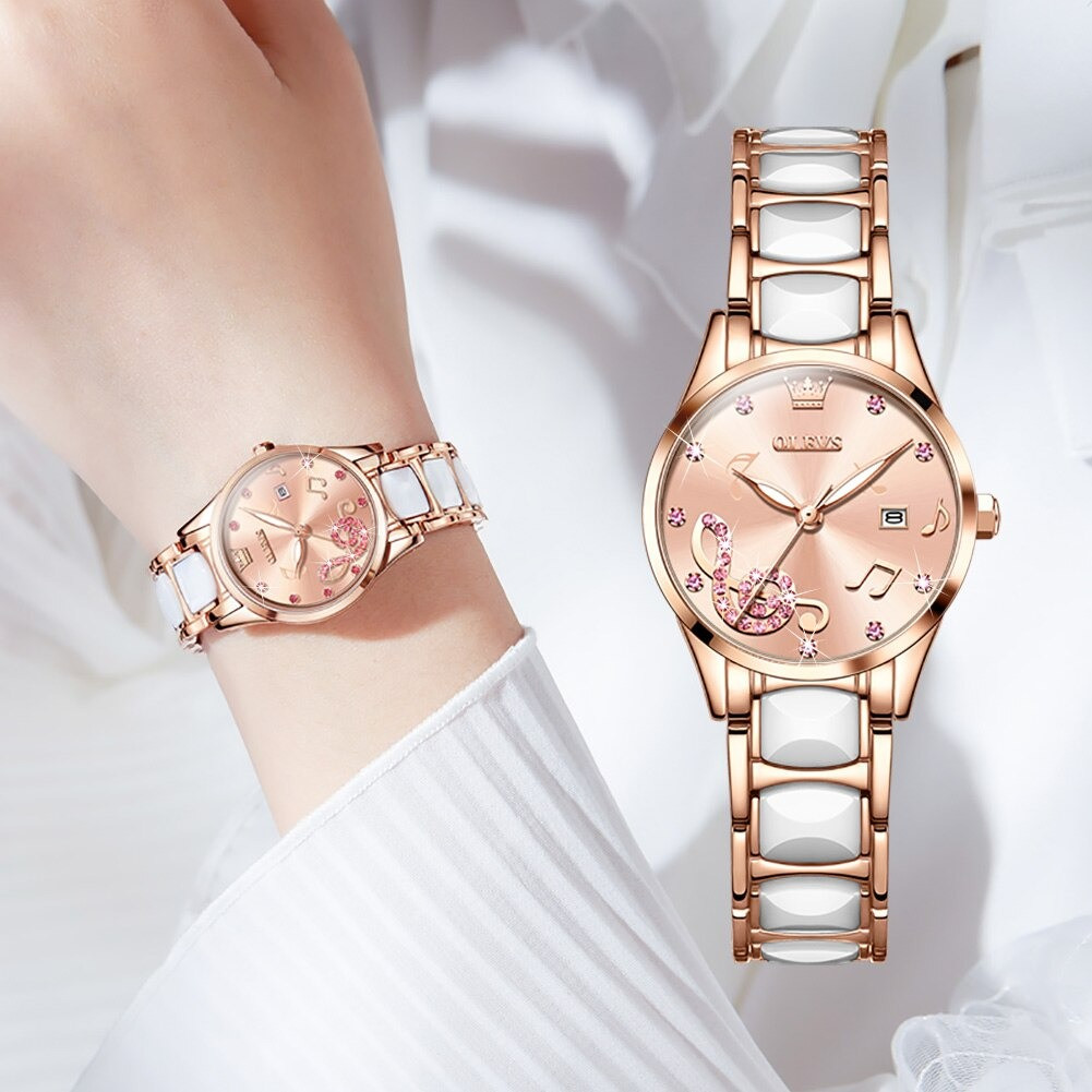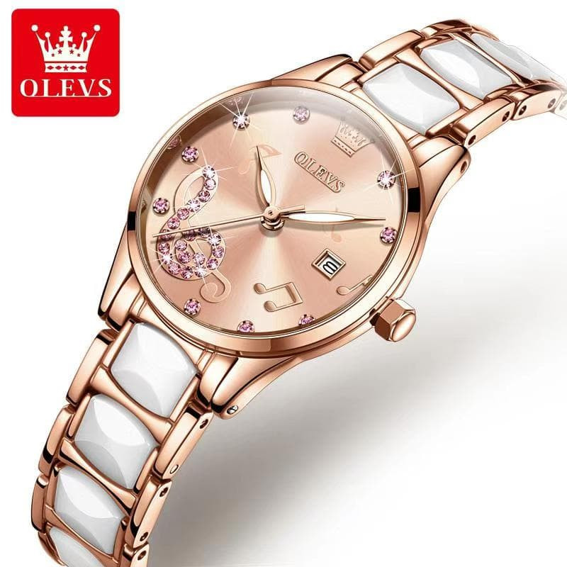 OLEVS 3605 Luxury Women's Fashion Simple Temperament Stainless Steel Ceramic Strap Quartz Watch Rose Gold White & Pink Color