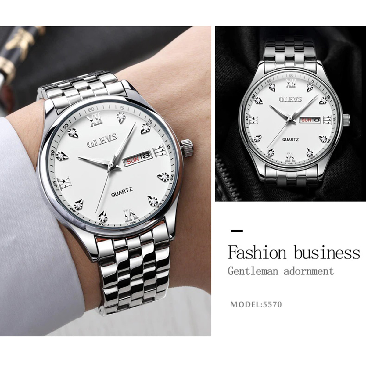 OLEVS 5570 Men's Stainless Steel Luminous Dial Date and Week Waterproof Quartz Wrist Watch- Silver