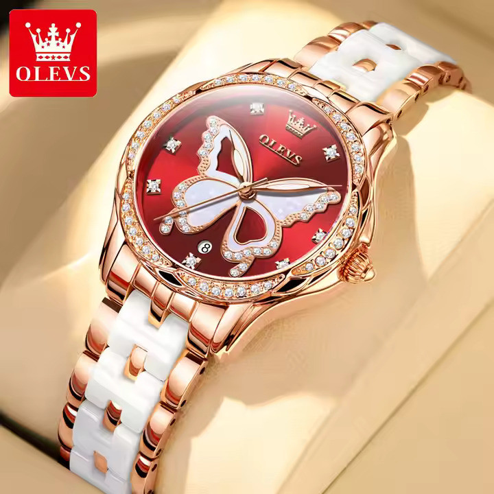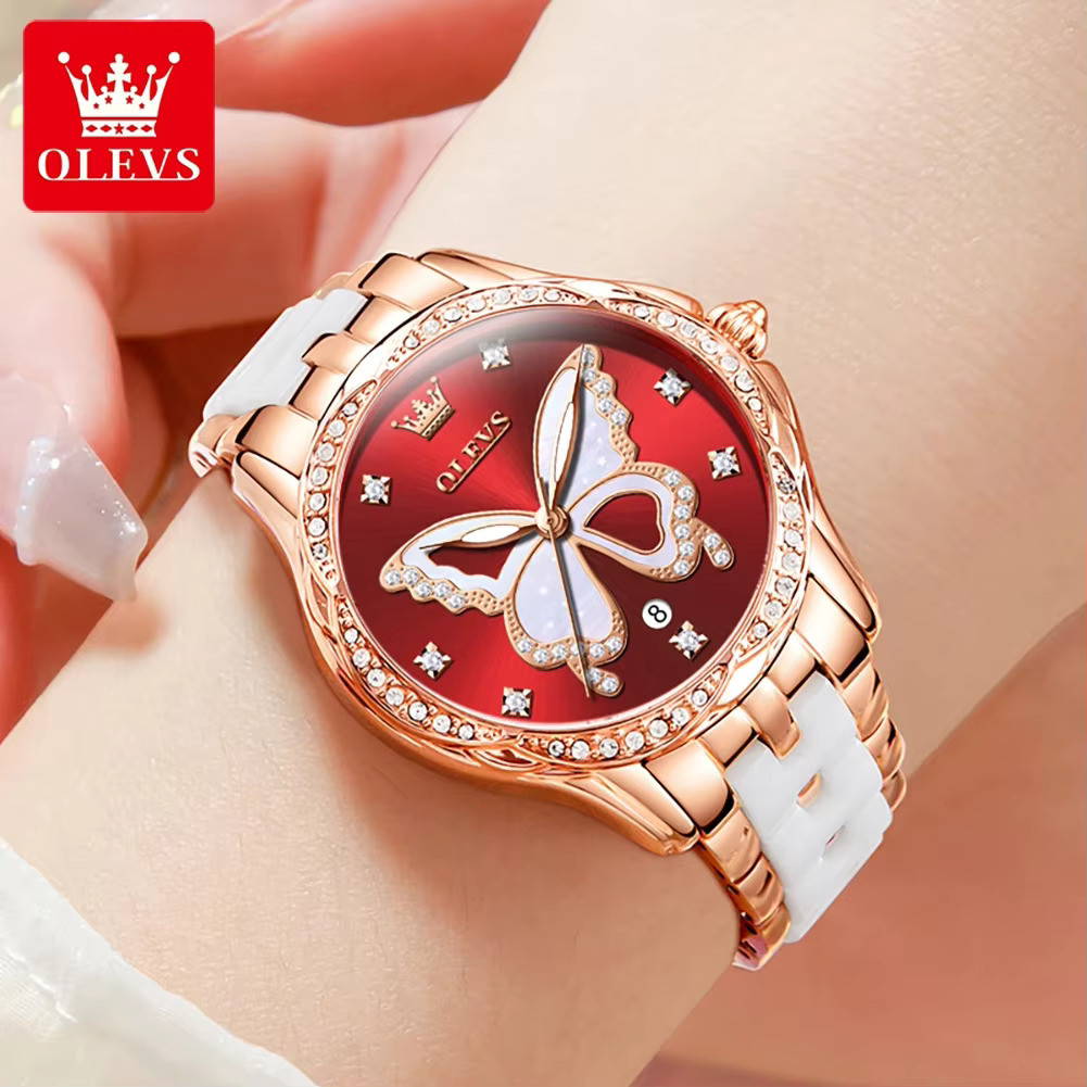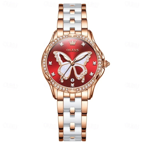 OLEVS 5610 Women's Quartz Ceramic Butterfly Diamonds Strap Waterproof Luminous Calendar Ladies Casual Wristwatch- Red Dial