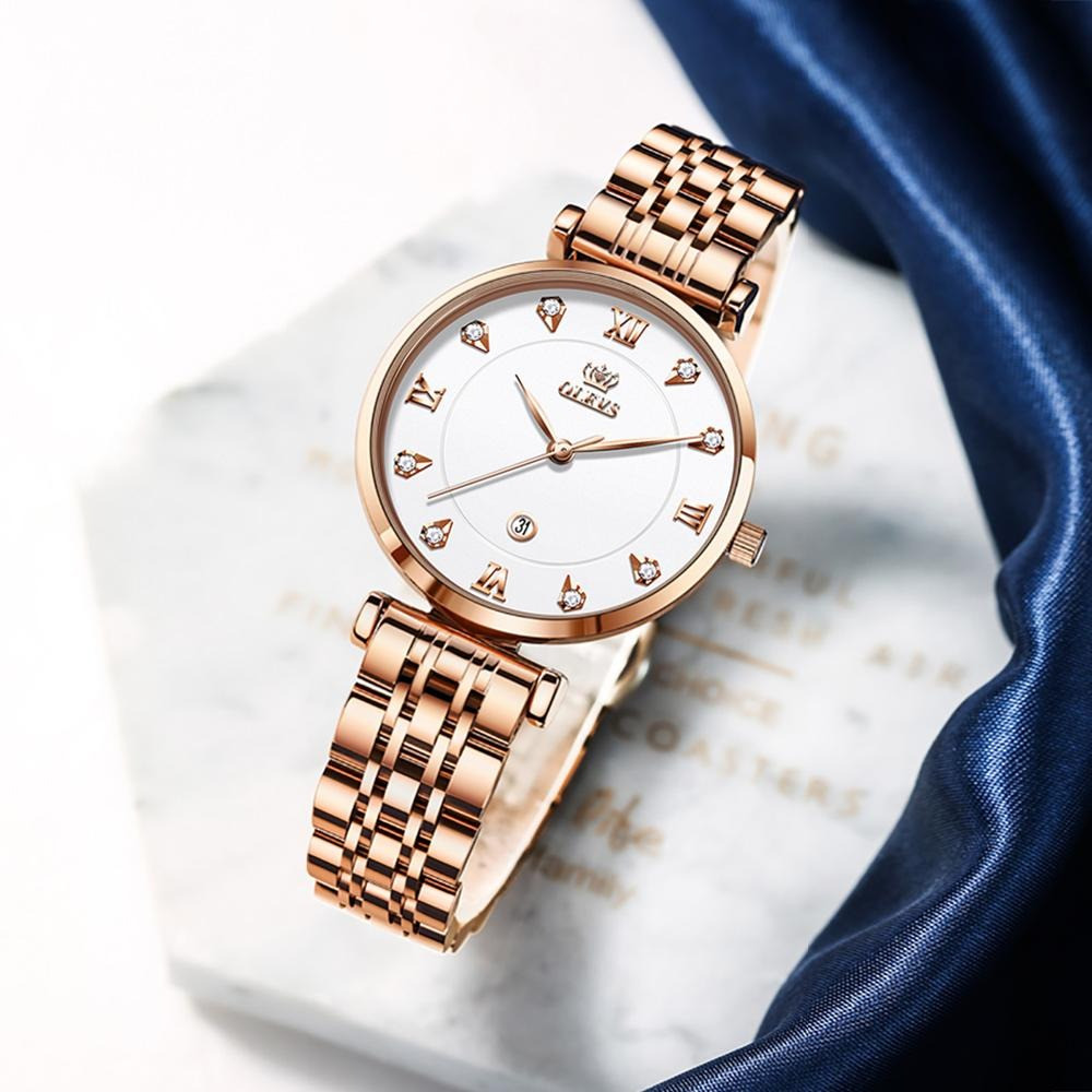 OLEVS 5866 Ladies Stainless Steel Waterproof Rose Gold and White Luxury Watches