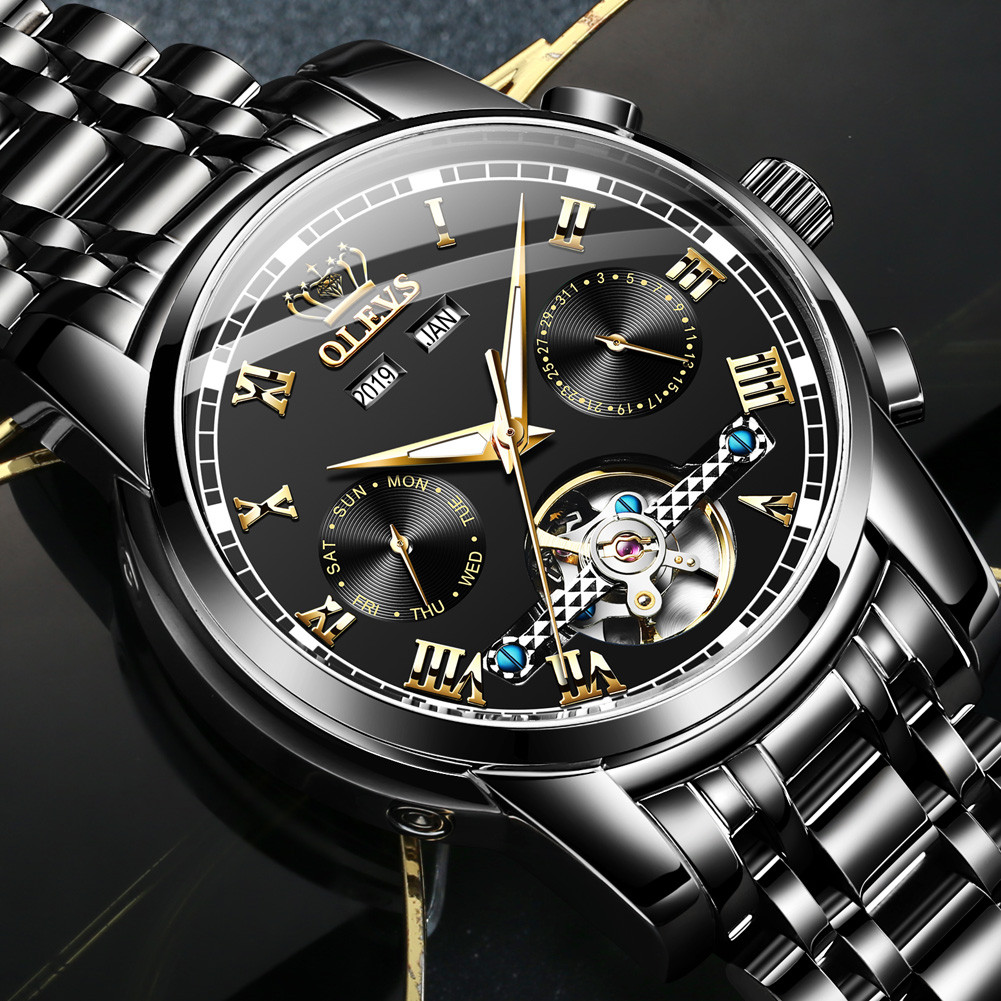 OLEVS 6607 Premium Quality Automatic Mechanical Fashion Stainless Steel Waterproof Watch for Men's- Black