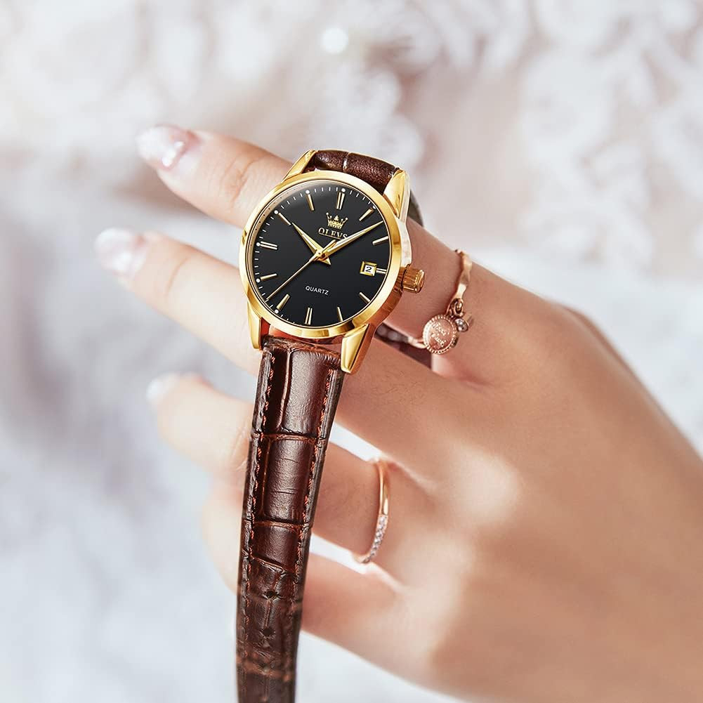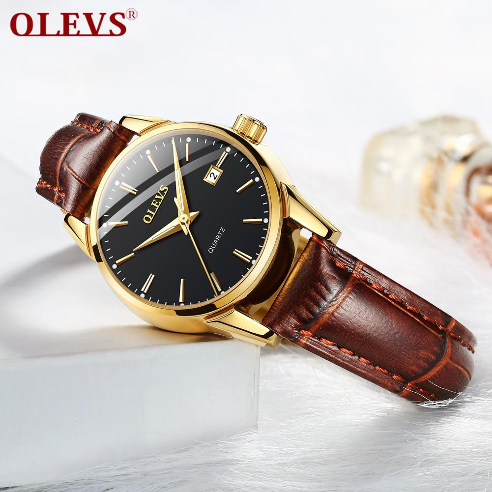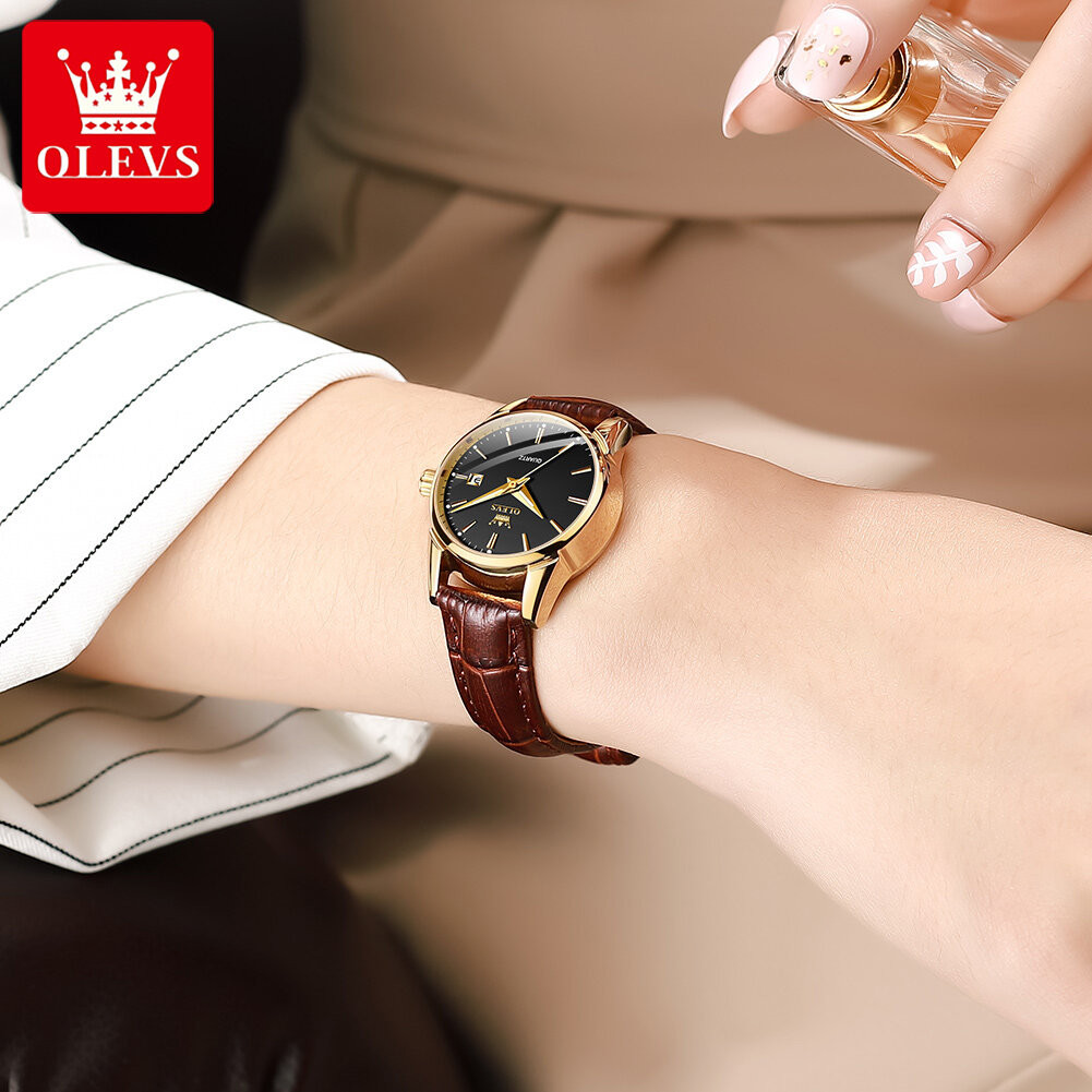 OLEVS 6898 Black Dial Genuine Leather Watch For Women