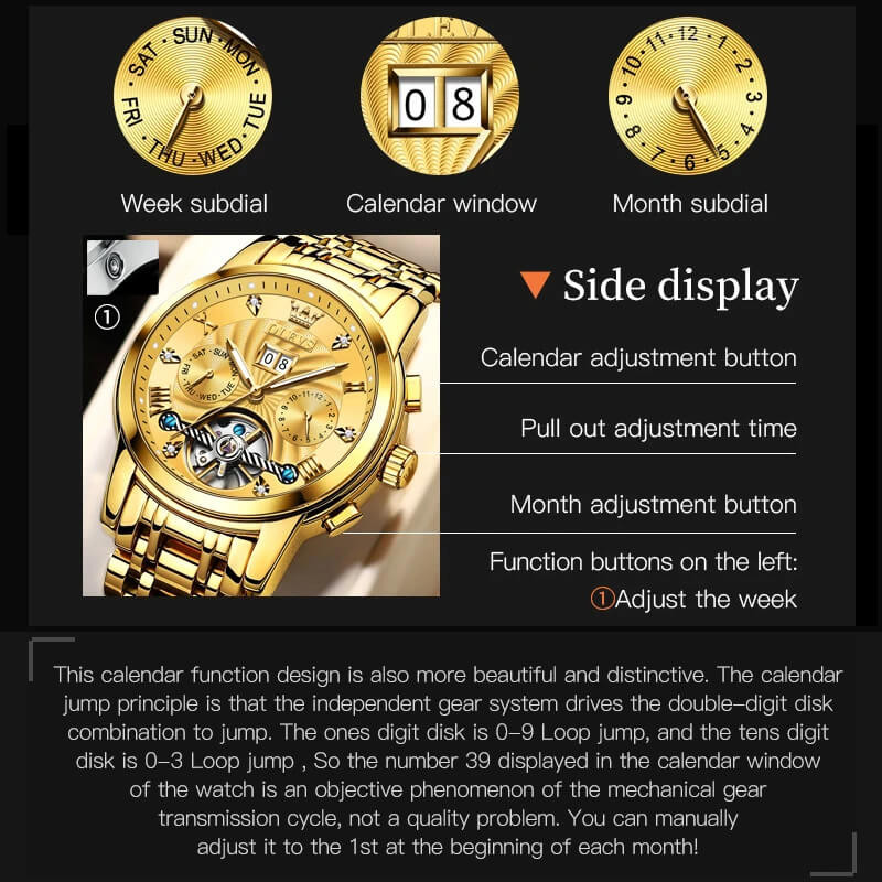 OLEVS 9910 Golden Men's Automatic Mechanical Tourbillon Slef-Wind Luxury Stainless Steel Watch