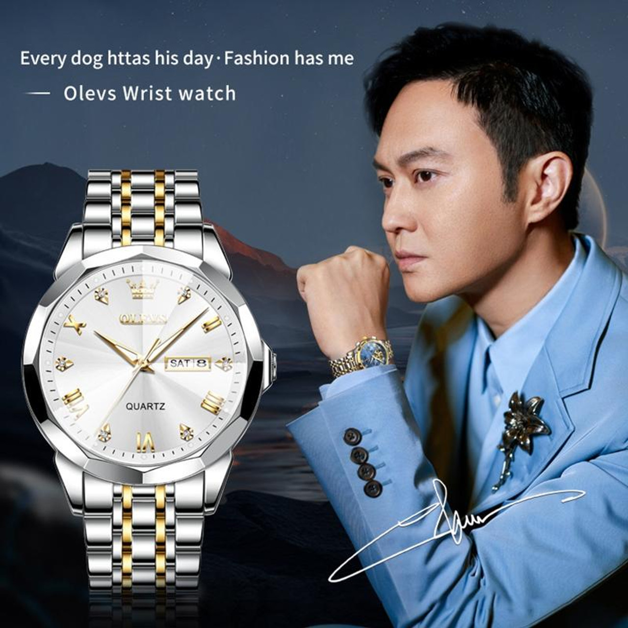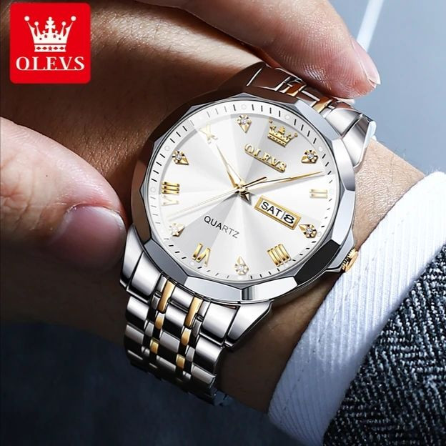 OLEVS 9931B Quartz Watch for Men Dual Calendar Luxury Diamond-Cut Dial Waterproof Stainless Steel Strap Men Wristwatch