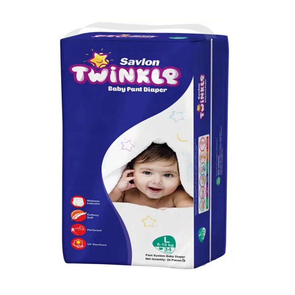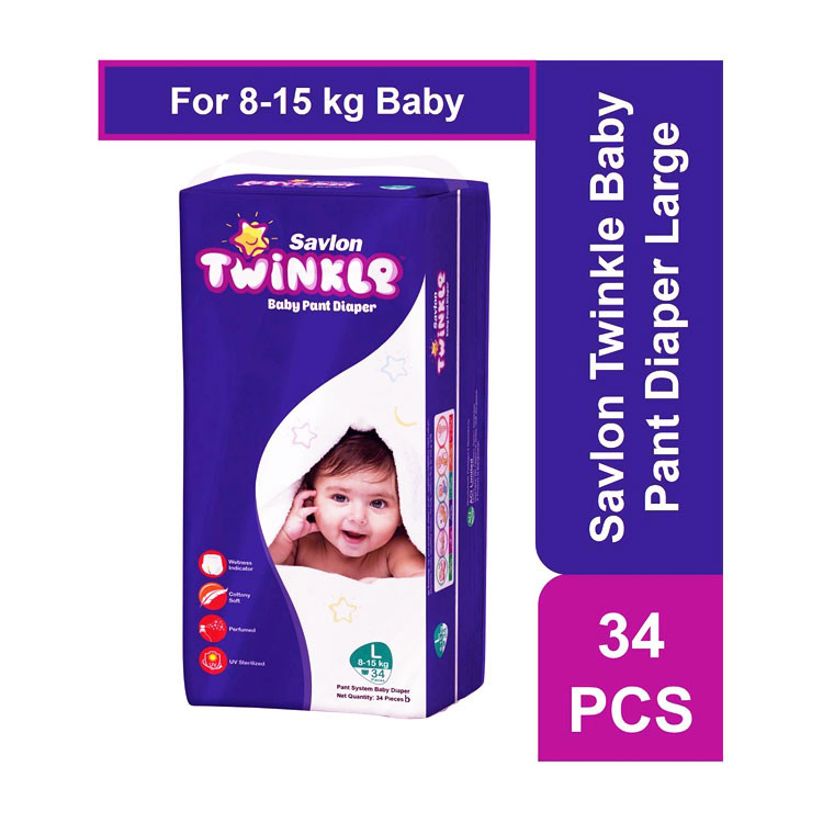 Savlon Twinkle Baby Pant Diaper Large 34 Pieces is a soft diaper. Twinkle Baby Diaper is an unfailing companion in the wonderful journey called motherhood. Completely Leak Proof.